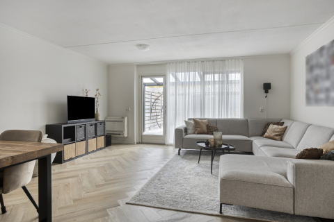 De uitgebouwde woonkamer en keuken vormen samen een royale, lichte leefruimte van bijna 47m2. De duoplank houten vloer met hoge witte plinten en spachtelputz wanden geven de ruimte een luxe en warme uitstraling. De grote ramen en de loopdeur naar de tuin laten veel daglicht binnen en verbinden binnen en buiten op natuurlijke wijze.